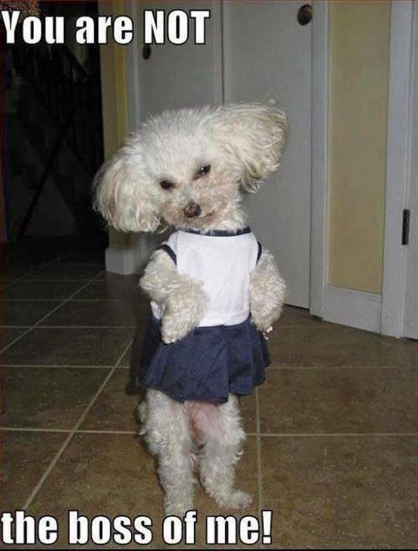 You are not the boss of me! I sometimes think that is what some of my furry charges cycle through their brain when I try to act like I am in charge! It happened three times today. First I got a “look” from Diesel when I was trying to get him to stand still to get his collar on for his walk. I commented he needed to quit racing about, which wasn’t at all appreciated as his friend Lucas was standing in his living room and well hell, it was time to impress his buddy, that wasn’t cool…why was I being such a party pooper? Then while enjoying a lunch hour stroll with M & P, my little friend put a yucky kleenex in his mouth and I curtly scolded him by telling him to drop it! Pud looked up at me as if to say “You don’t have to get so snippy, geez!” Then when we got back to the house, I reminded Miss Mattie that she needed to go into the kitchen area where they hang out when no one is home, she crept into the living room, like maybe I wouldn’t notice or perhaps if she looked uber cute I might let it slide and she could have her way. I made the comment that her bed wasn’t in that room and she needed to join Pud, she was thoroughly unimpressed with me, the glare and grumble I got. If there was a magic bubble above her head where text could express her opinion it would have said “YOU ARE NOT THE BOSS OF ME!” I guess the election results in the U.S today is making all of god’s creatures a little testy and wanting to question those that think they are in charge :o)
