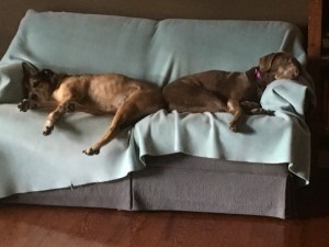 Hmmmmm, this was the scene that met my eyes this afternoon! Looks like these fur babies had an exhausting morning!? My four legged friends did have a stroll to start off their day, that lasted about a half hour, and keep in mind, the dog on the left is 13 ish so our pace was more of a leisure one. Once we returned home the two found the couch and I headed out the door for to walk my friend Mia for forty minutes, followed by a thirty minute jaunt with Marcus and then another fifteen with my girl Sunny. No worries, they aren’t comatose, they did have a few bathroom breaks in between my comings and goings. I realized though, that after taking about 20,135 steps with my canine friends all before noon, it was time to tackle my ‘to do’ list before time got away from me and the afternoon walks were to commence! I did a couple loads of laundry, changed a bed, made soup and scones for dinner, ironed a few items and got the mulch, garbage and recycles out to the curb…while these two enjoyed a wonderful slumber! I have about fifteen minutes before I need to rouse these BFF’s and get them out for their second walk. I kind of would like to curl up on the couch with them on this chilly fall day, but I am painfully aware of the fact that there is no room for me and if I am dumb enough to enter that room and disturb the scene I will be leaving sooner than I planned! I am keenly aware that a potential trip to the bathroom will create a hub bub of excitement and a race to the front door ! Instead I quietly came into the office to do a bit of paper work and will let the sleeping dogs lie… It’s a dog’s life at my house!